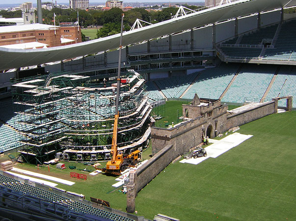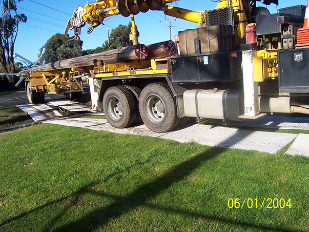 TrakMat® kept this crane truck safely off the grass and on the job during setup of the 2000 Military Tattoo in Aussie Stadium, Sydney NSW